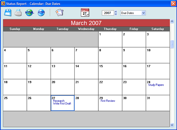 When in calendar view mode, you can select to view the Due Dates, Start Dates and actual Finish Dates. See how easy is to scroll the calendar up and down and locate your important dates. Clicking a date which has assigned Due Dates, Start Dates or Finish Dates will display further details (so that you can read long task names). Clicking the calendar button again will bring you to today's date. Click the Report button (or Chart button) to go back to the report view.