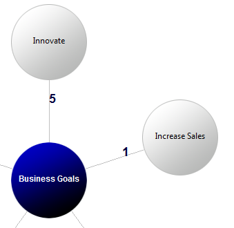 A top-level goal is represented by the central blue sphere. You can name it or rename it by right-clicking the mouse or clicking the "Edit" button while the sphere is selected. Goals that contribute to the top level goal are represented by the gray spheres. Add them by clicking the "Plus" button on the toolbar or hitting the Ctrl+K keyboard shortcut. To make your goals more manageable, break them down further into sub-goals. You can add sub-goals to a goal by clicking on the "Plus and Arrow" toolbar button or the Ctrl+Shift+K keyboard shortcut.